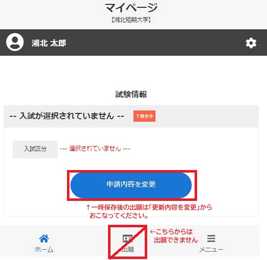 [申請内容を確認]より、エントリーシートを提出してください。画面下部の[出願]ボタンはクリックしないようにしてください。